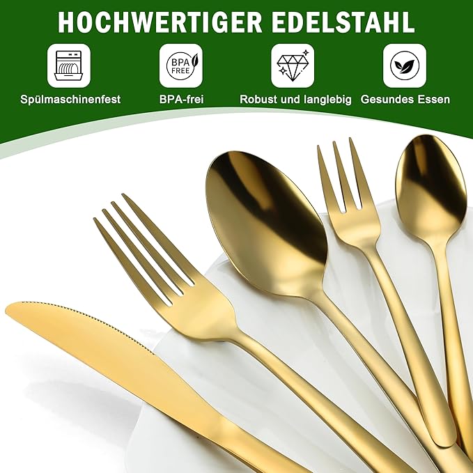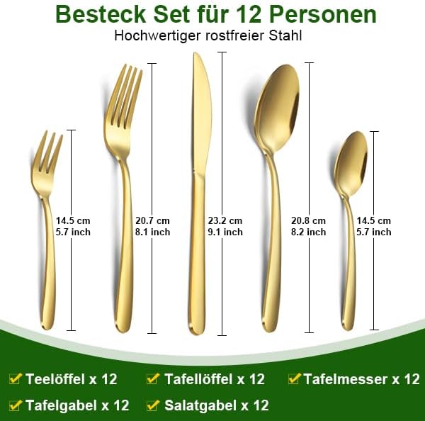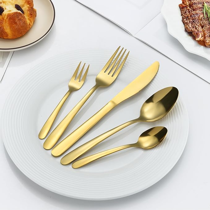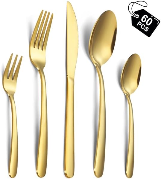 Conjunto de Talheres 60 Peças Dourados – Aço Inoxidável Polido, Resistente e Lavável na Máquina – Serviço Completo para 12 Pessoas (Facas, Garfos, Colheres, Colheres de Chá e Sobremesa)
