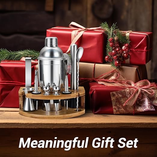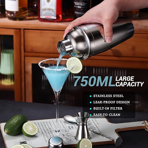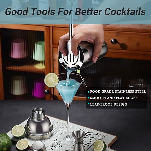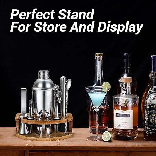Feito em aço inoxidável de qualidade alimentar e com um suporte de bambu elegante, este kit inclui todas as ferramentas essenciais para preparar cocktails clássicos como Margarita, Mojito, Martini, Manhattan, Long Island Ice Tea e muito mais.