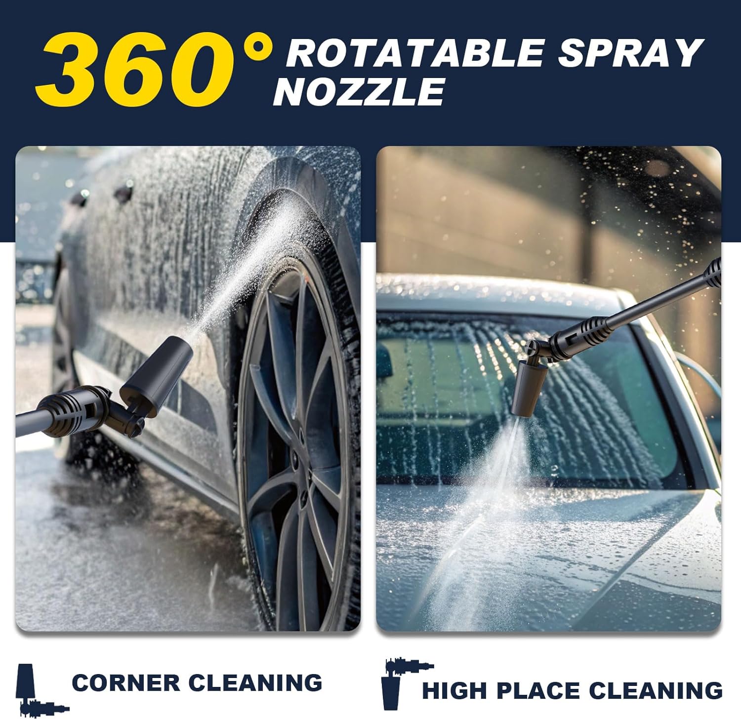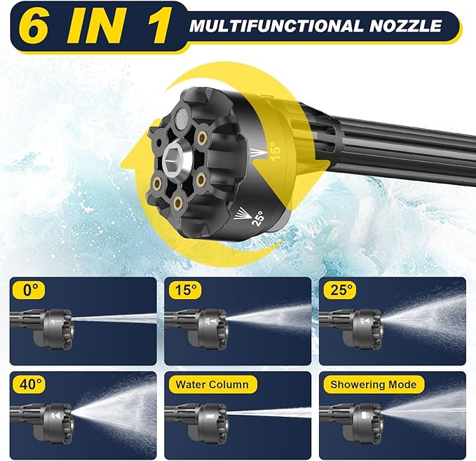 Inclui bocal multifunções 6-em-1 e bico giratório de 180°, adaptando-se a diferentes necessidades: lavar carros, bicicletas, ferramentas de jardim, barcos, janelas, paredes, terraços, cercas, piscinas e muito mais.