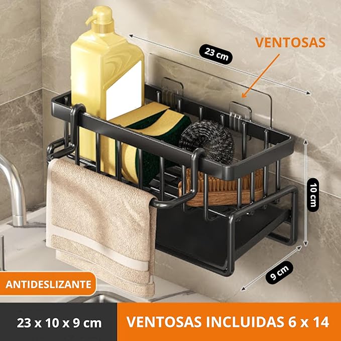 Organizador de Lava-loiça em Aço Carbono – Suporte com Ventosas Antiderrapantes, Porta-Esponjas e Acessórios de Cozinha – Preto