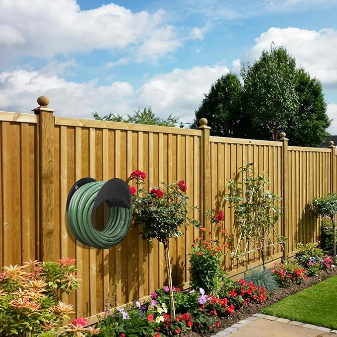 O acabamento especial previne ferrugem e desgaste, mantendo o suporte com aparência nova mesmo após anos de uso no exterior. O design compacto para montagem na parede ajuda a economizar espaço e evita que a mangueira fique dobrada ou danificada, mantendo o jardim limpo e seguro.