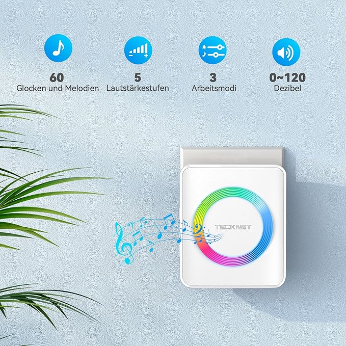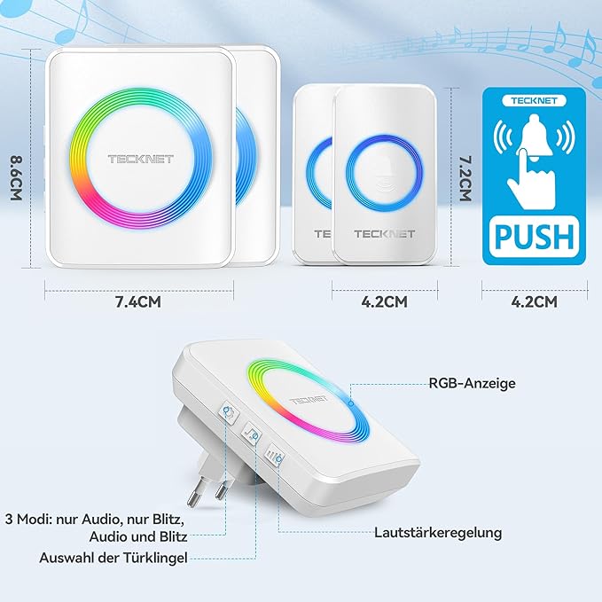 TECKNET Campainha Sem Fios | Kit com 2 Recetores e 2 Transmissores, Alcance 400 m, IP65 à Prova de Água, 60 Melodias, 5 Níveis de Volume, Luz RGB – Cor Branco