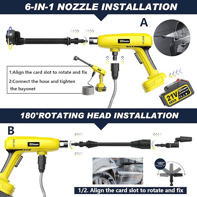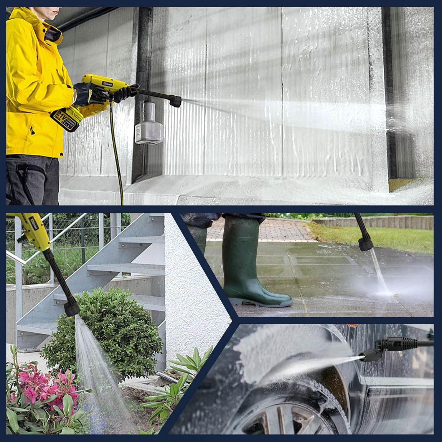Inclui bocal multifunções 6-em-1 e bico giratório de 180°, adaptando-se a diferentes necessidades: lavar carros, bicicletas, ferramentas de jardim, barcos, janelas, paredes, terraços, cercas, piscinas e muito mais.