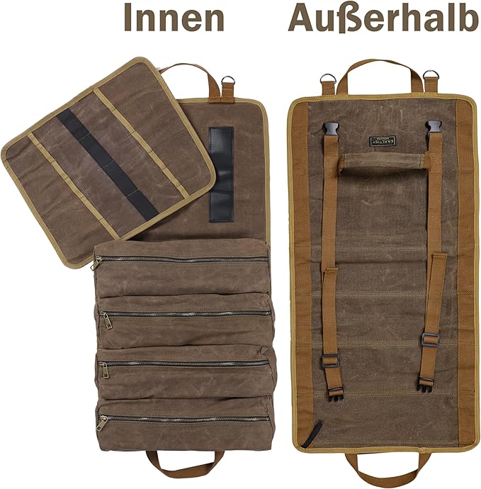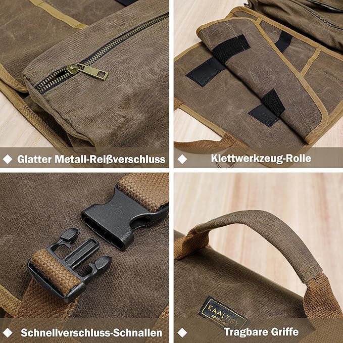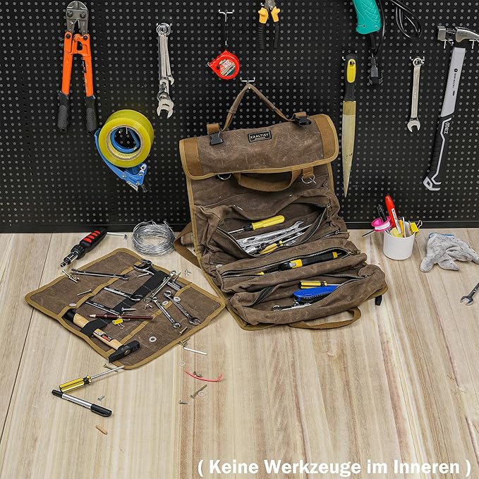 Organize as suas ferramentas de forma prática e duradoura com o saco de armazenamento Kaaltisy. Fabricado em tecido oleado pesado de 16 oz, resistente ao desgaste e repelente à água, este conjunto é ideal para profissionais e entusiastas de bricolage.