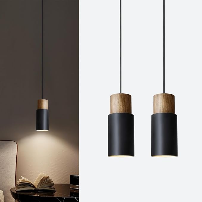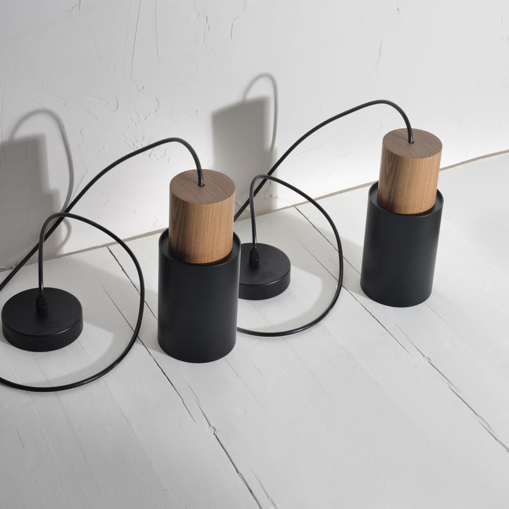 Candeeiros suspensos com toque industrial vintage, combinando alumínio preto resistente com coluna em madeira trabalhada à mão, criando uma peça elegante, artística e versátil para qualquer ambiente.