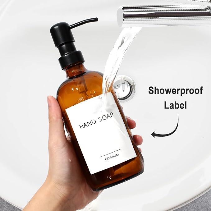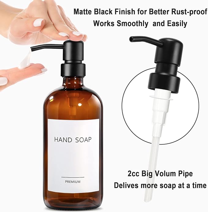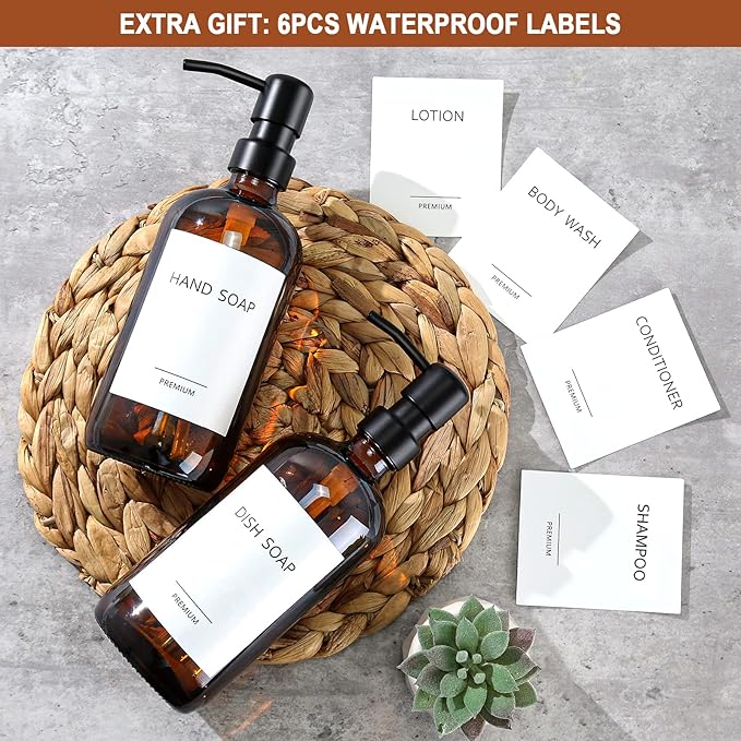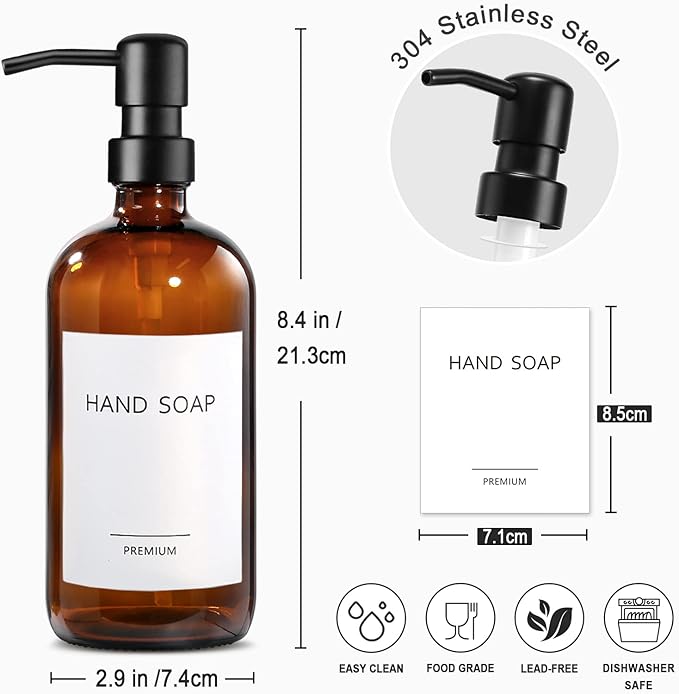 Conjunto de 2 Dispensadores de Sabão em Vidro Âmbar 500 ml com Bomba em Aço Inoxidável, Garrafas Vintage Reutilizáveis com Etiquetas para Cozinha, Casa de Banho e Duche