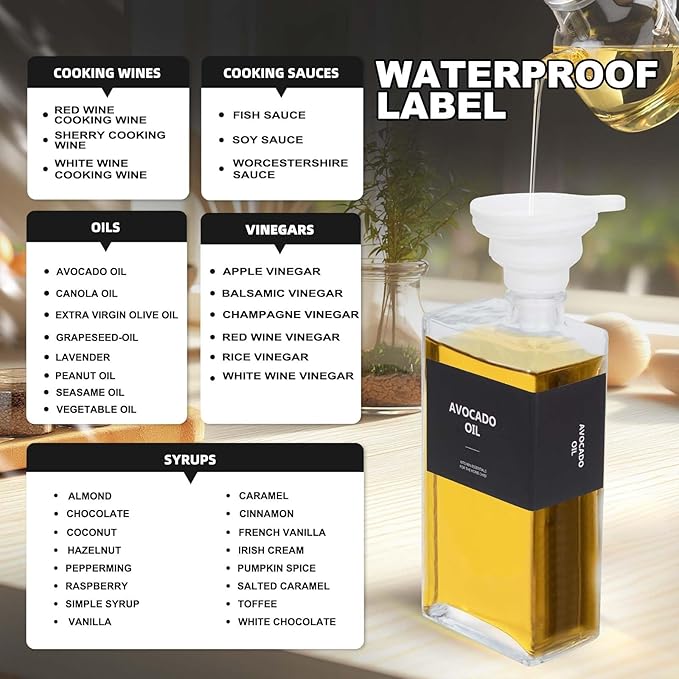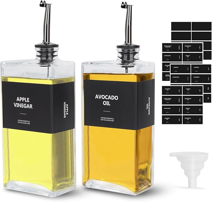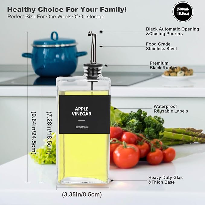 • Conjunto completo de dispensadores de azeite – Inclui 2 garrafas de vidro transparente de 500 ml (16,9 oz), 2 doseadores automáticos de abertura/fecho em preto, 1 funil de silicone e 40 etiquetas impermeáveis para organização prática.