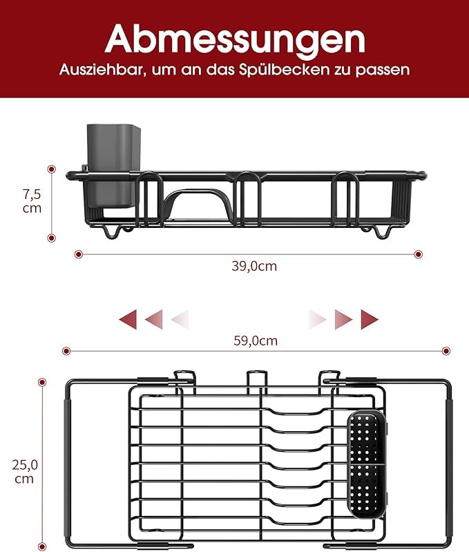 📏 Ajustável para a maioria das pias: Mede 39 x 25 x 7,5 cm e pode ser estendido até 59 cm de comprimento, adaptando-se a diferentes tamanhos de lava-loiça. As extremidades com revestimento antiderrapante garantem estabilidade e evitam deslizamentos.