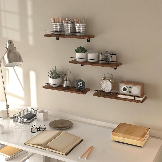 Fabricadas em madeira castanha de qualidade e ferro preto resistente, estas prateleiras oferecem uma estrutura sólida e duradoura. O conjunto inclui 4 peças, cada uma com dimensões de 39,8 x 12,8 x 1,5 cm, perfeitas para suportar diferentes tipos de artigos.