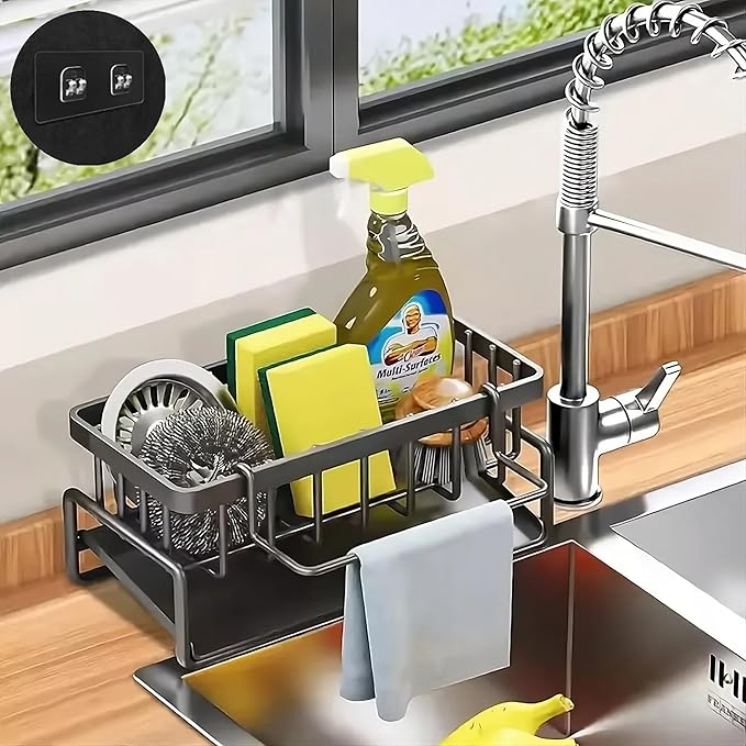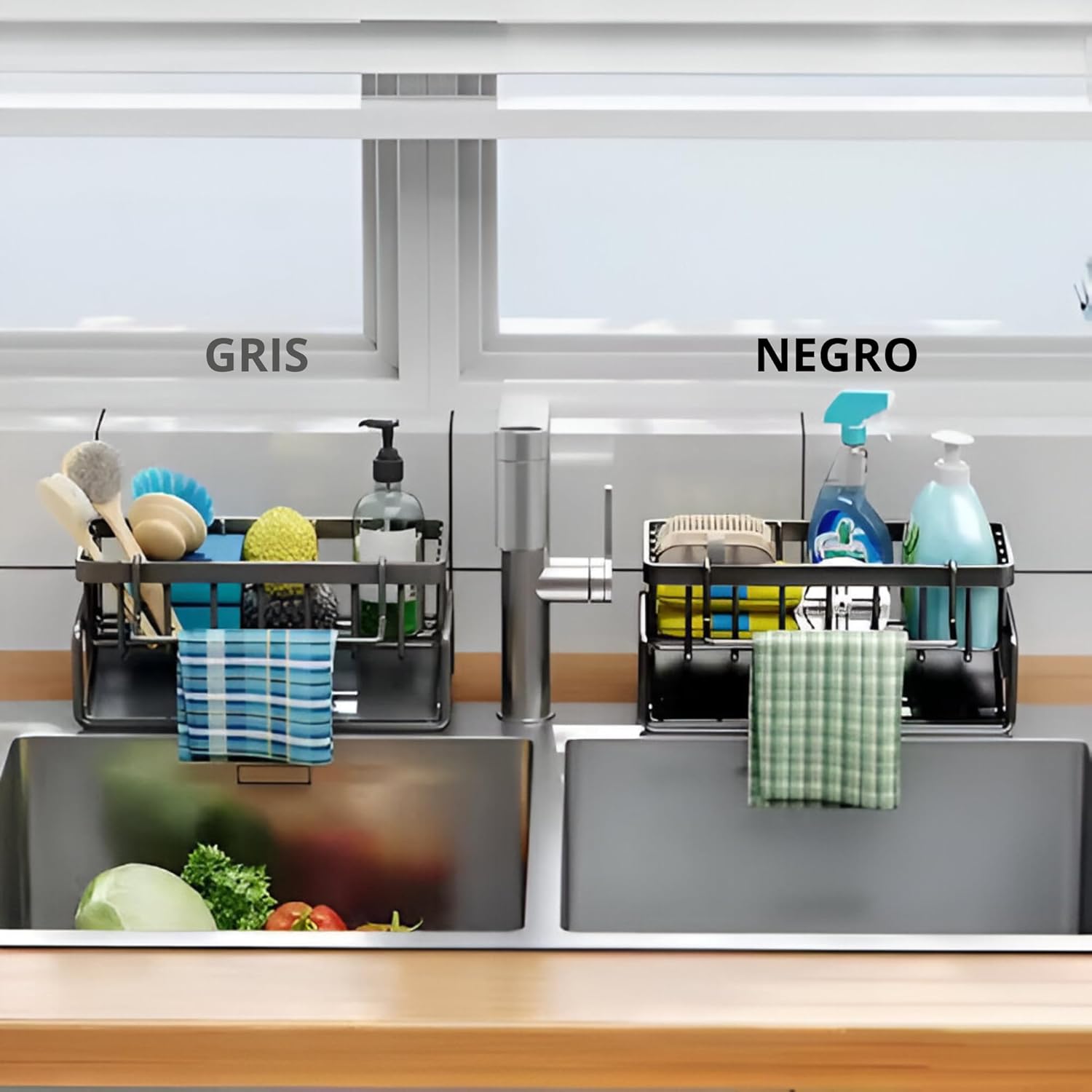 Organizador de Lava-loiça em Aço Carbono – Suporte com Ventosas Antiderrapantes, Porta-Esponjas e Acessórios de Cozinha – Preto