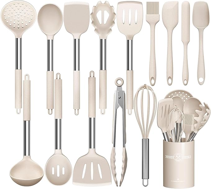 Resistentes ao calor | Antiaderentes | Sem BPA | Inclui espátulas, pinças, batedor e muito mais | Cor: Caqui