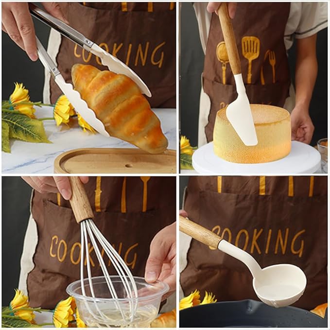 Conjunto de Utensílios de Cozinha 16 Peças – Silicone Resistente ao Calor + Cabos em Madeira – Colher, Espátula, Concha, Batedor, Pinça e Suporte – Cor Marina Bay Blue
