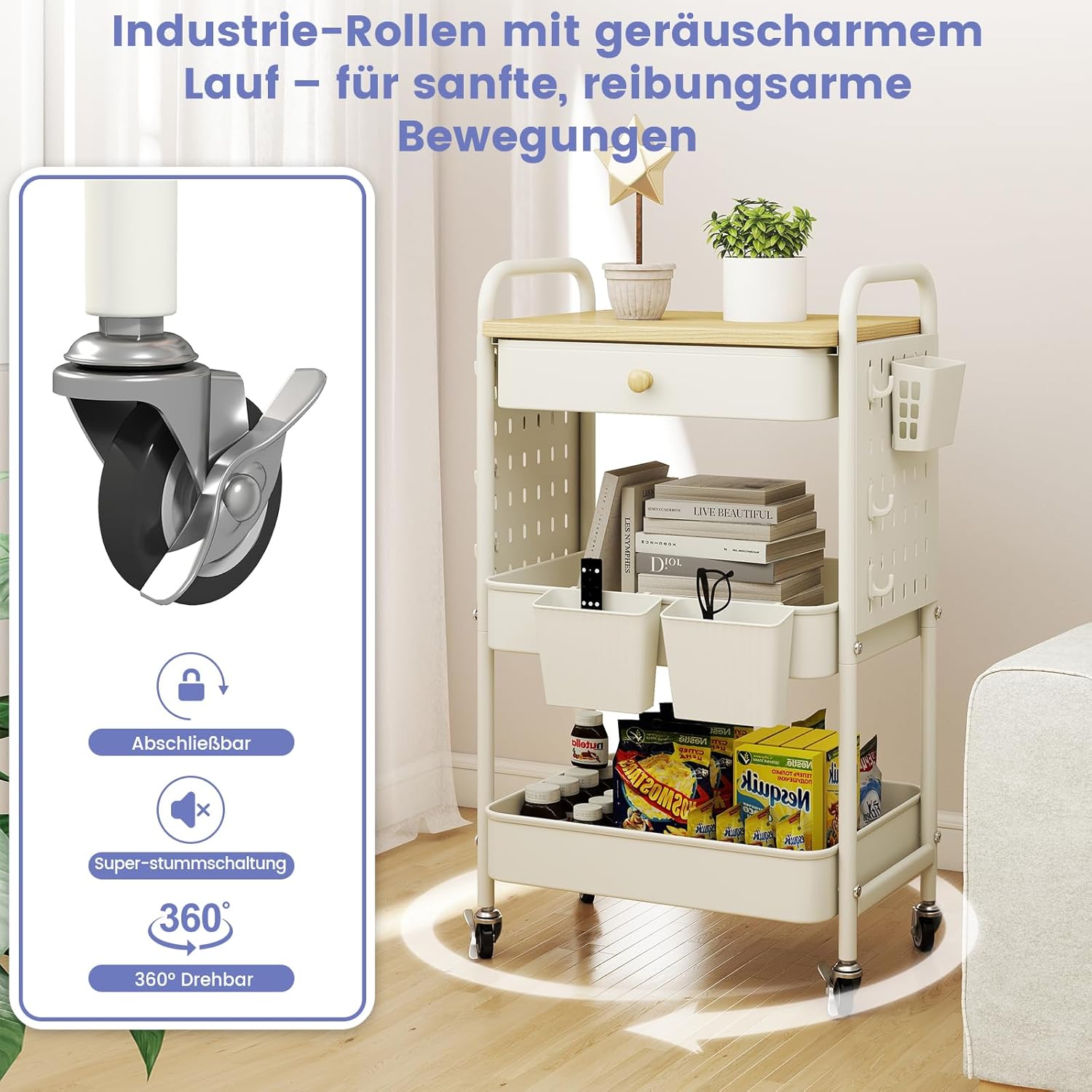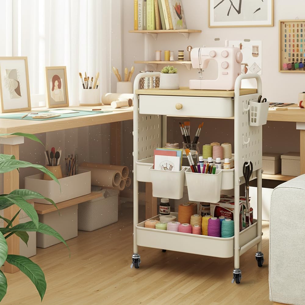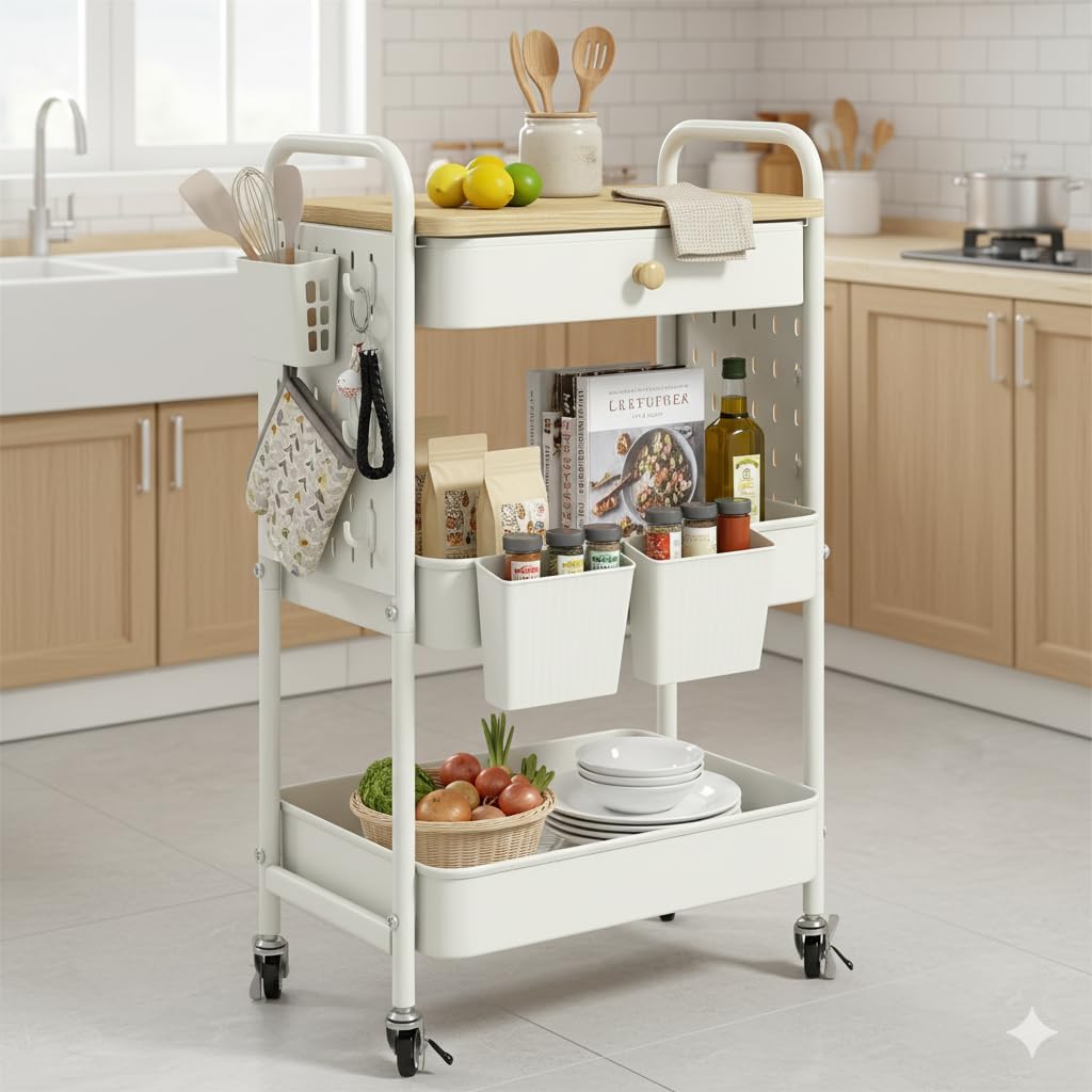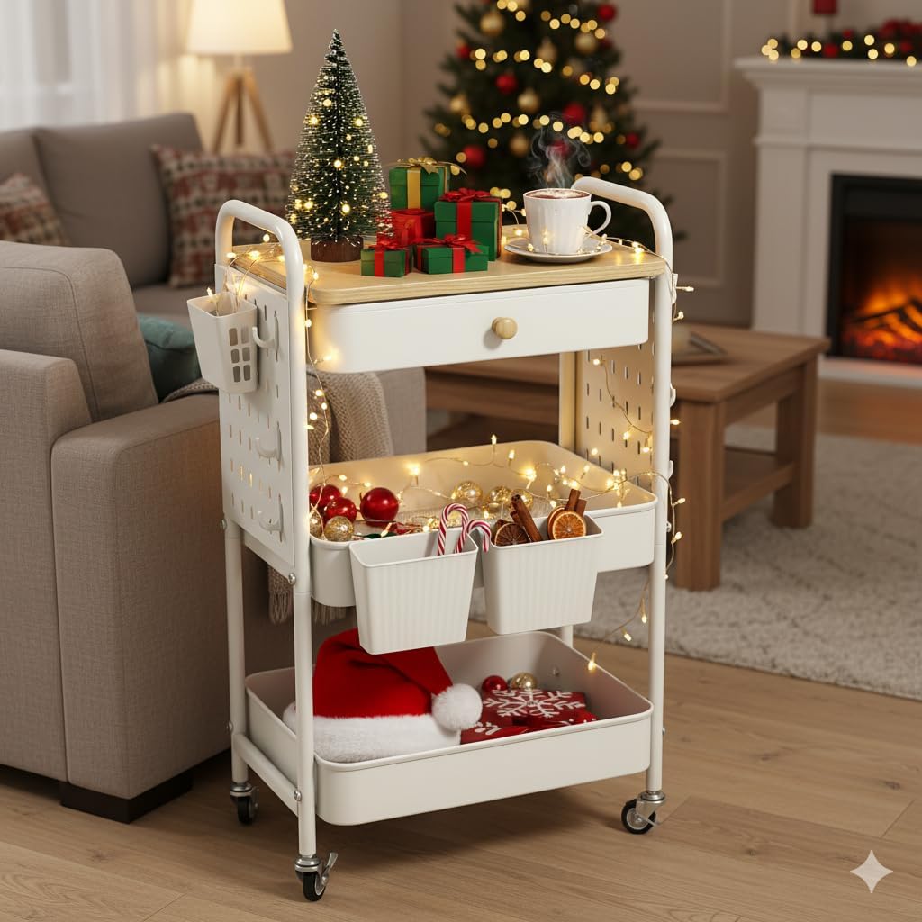 Funciona como carrinho de apoio, de arrumação, de artes, de utilidades ou decorativo.