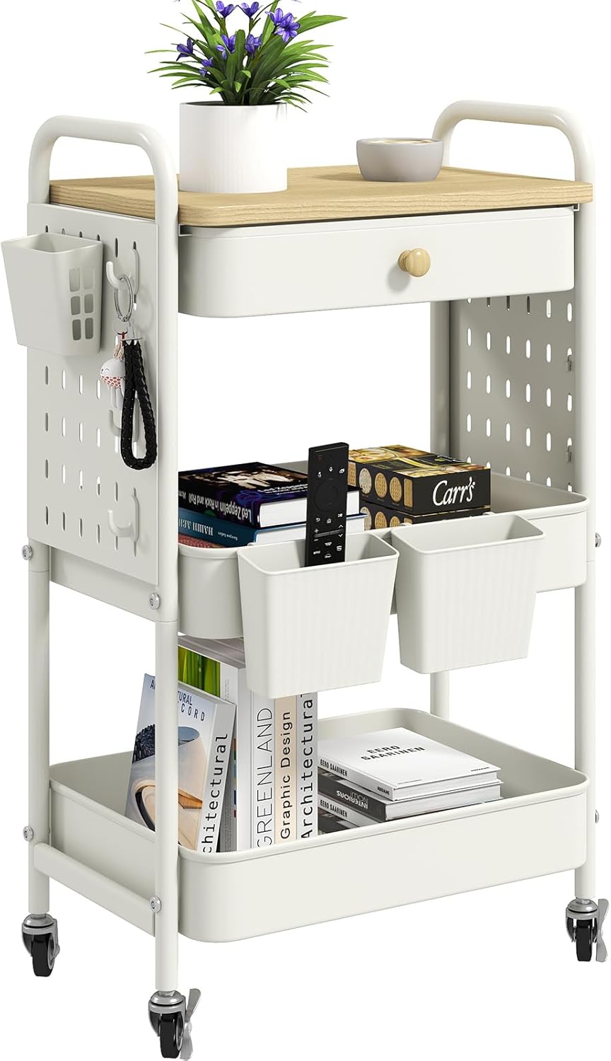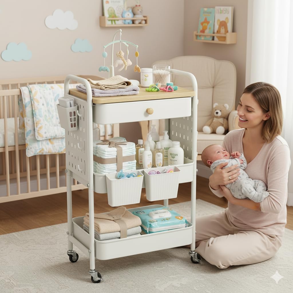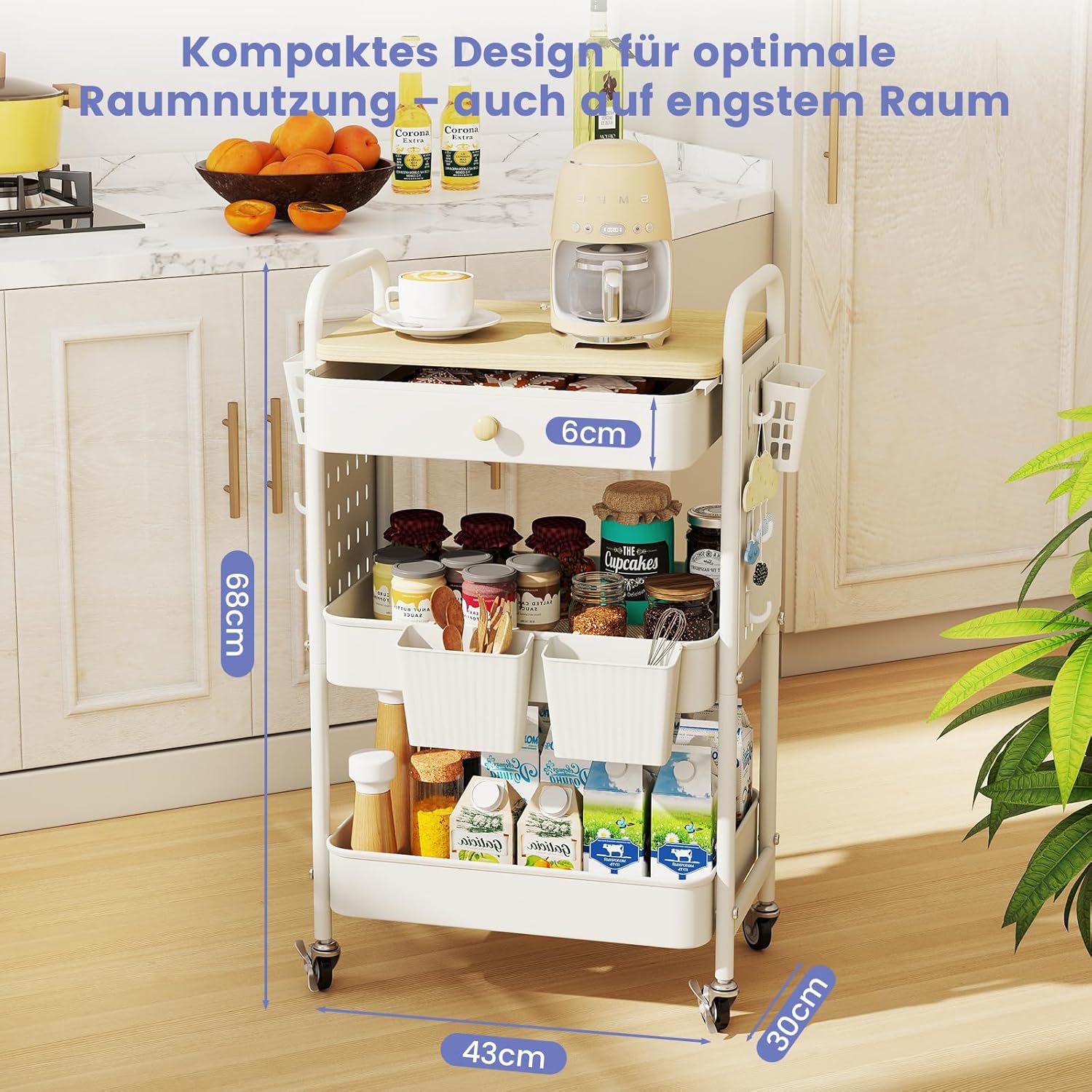 Funciona como carrinho de apoio, de arrumação, de artes, de utilidades ou decorativo.
