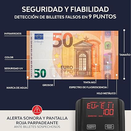 Verifica autenticidade e conta notas de EUR, USD e GBP.