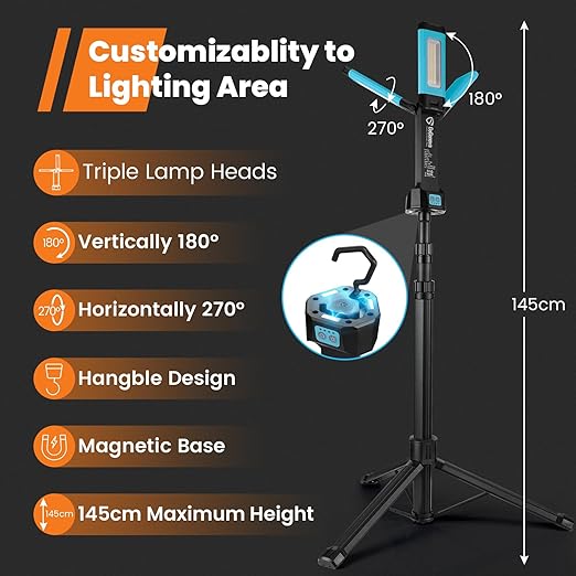 Cabeça com 3 módulos de luz ajustáveis a 180°/270°, permitindo iluminar áreas amplas ou focar pontos específicos.