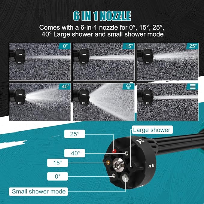 Inclui um bico rotativo com 6 modos: 0°, 15°, 25°, 40°, jato de chuveiro e jato intermitente.