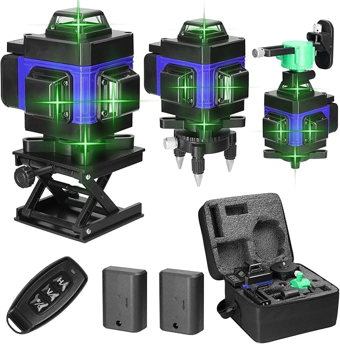 Geevorks Nível Laser 4D 16 Linhas Verde – Auto Nivelante ±3°, 2 Baterias Recarregáveis, Base Rotativa 360°, Suporte de Montagem, Controlo Remoto e APP Mobile