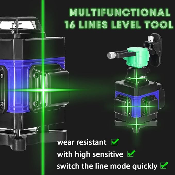 📏 Precisão 4D com 16 Linhas: Projeção de linhas finas e nítidas em todas as direções, ideais para marcações em azulejos, pisos, tetos e paredes.