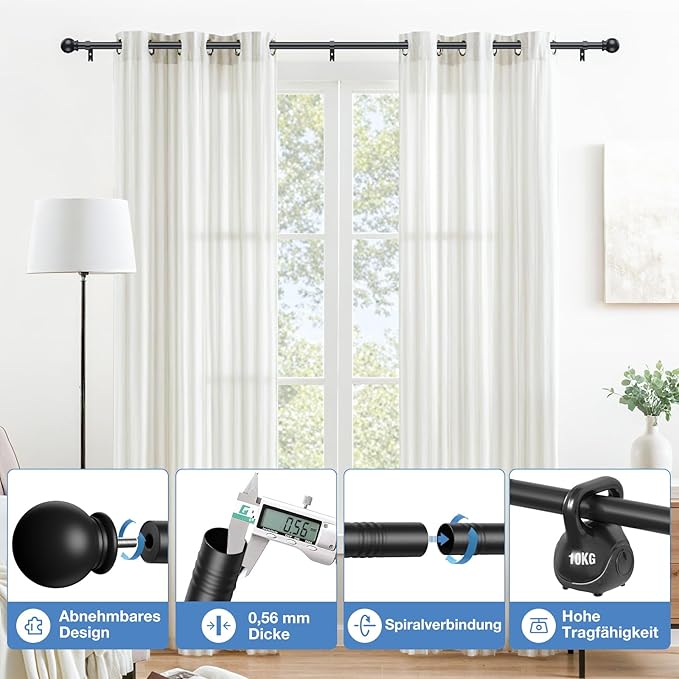 Varão fabricado em metal robusto com 16 mm de diâmetro, ideal para cortinas pesadas.