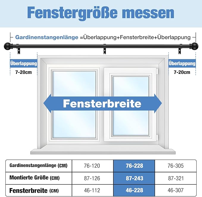 Adequado para janelas com larguras de 46 a 228 cm