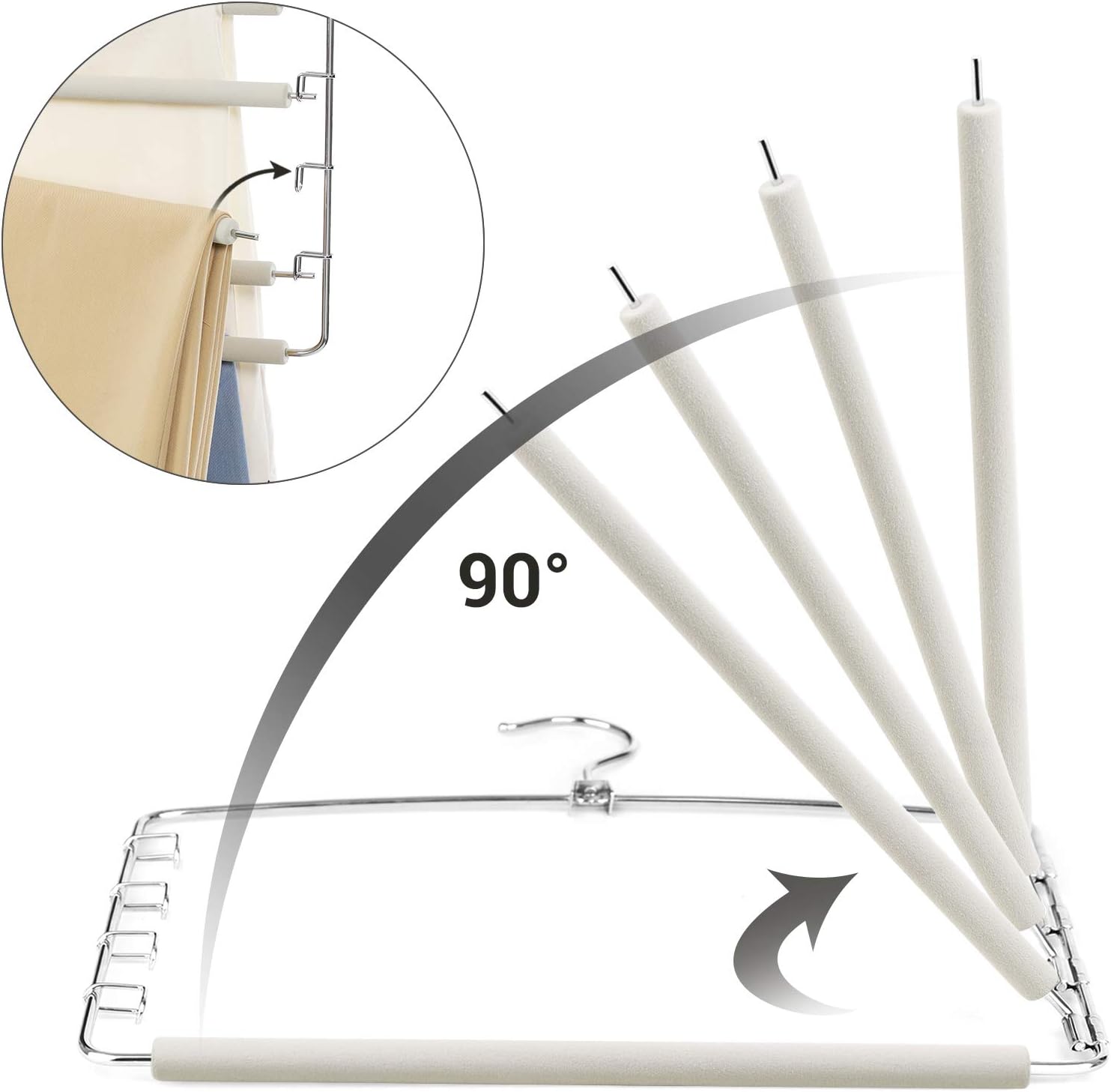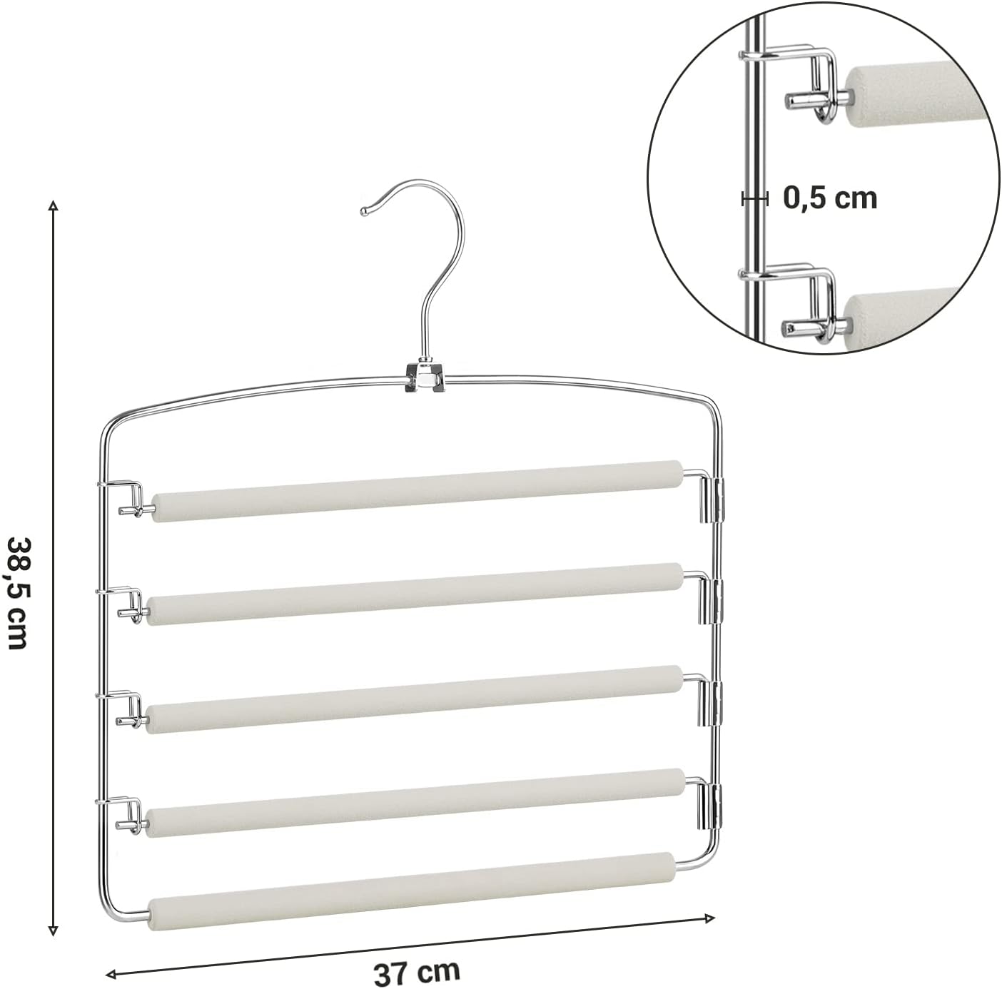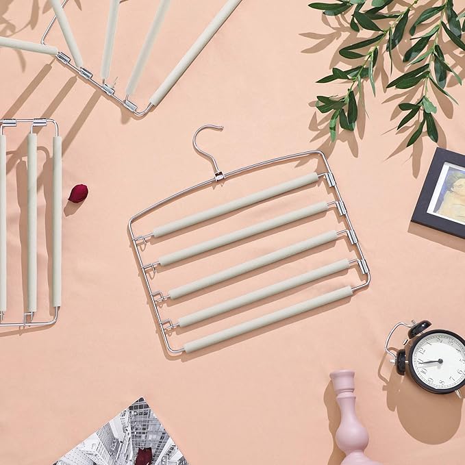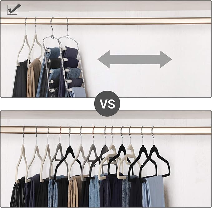 Mais espaço no seu guarda-roupa: Cada cabide possui 5 barras horizontais, ideais para pendurar calças, lenços, gravatas, cintos, toalhas ou tops de alças. Um conjunto de 3 cabides permite organizar até 15 peças de roupa de forma compacta.