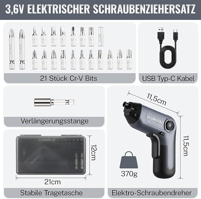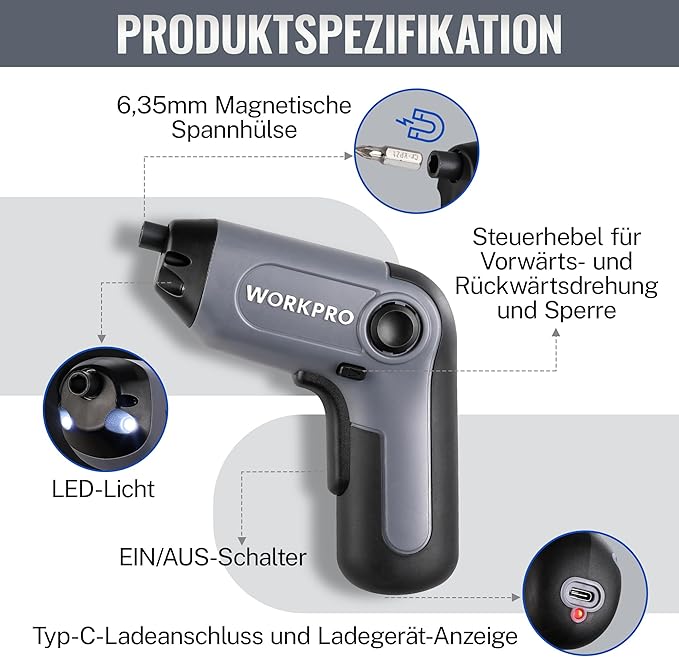 A WORKPRO 3.6V é uma aparafusadora sem fios compacta e potente, perfeita para pequenos reparos domésticos e projetos de bricolage.
